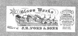 Ford's son Emory graduated in July 1864 from Duff's Mercantile College upriver in Pittsburgh. Emory marveled at the many glass works in the city, and soon they set up a small glass factory in New Albany known as the New Albany Glass Works. The company produced bottles and jars. In 1867, the Fords had greatly expanded the factory and began to study the technology to produce plate glass, which until now was imported from Europe. In 1870, they had successfully mastered the technology and had the skilled workforce in place to produce the first plate glass in the United States.