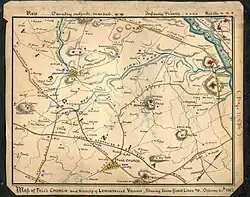 On the early morning of October 18, 1864, Captain Richard Montjoy led a contingent of at least 75 men from Company D of Mosby's command on a nocturnal raid into Falls Church.[10] The attack was initially successful, capturing several Union prisoners and a number of horses. However, the element of surprise was lost when members of the Home Guard blew a hunting horn as a warning to alert nearby Federal troops.[11]
