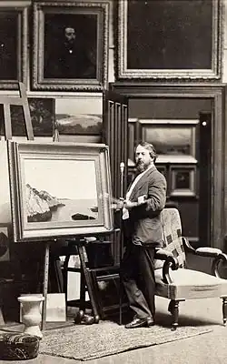 John Frederick Kensett (March 22, 1816 – December 14, 1872) was an American landscape painter and engraver born in Cheshire, Connecticut. He was a member of the second generation of the Hudson River School of artists. Kensett's signature works are landscape paintings of New England and New York State, whose clear light and serene surfaces celebrate transcendental qualities of nature, and are associated with Luminism. Kensett's early work owed much to the influence of Thomas Cole, but was from the outset distinguished by a preference for cooler colors and an interest in less dramatic topography, favoring restraint in both palette and composition.[1] The work of Kensett's maturity features tranquil scenery depicted with a spare geometry, culminating in series of paintings in which coastal promontories are balanced against glass-smooth water.[2] He was a founder of the Metropolitan Museum of Art.