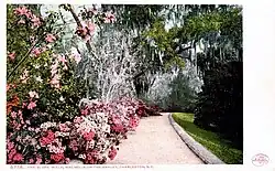 Old rice fields were no longer feasible to maintain and were shaped into an area served by intricate walking paths among the flowering plants.[55] Adam Bennett continued as his master gardener.[56] In 1872 the gardens were opened to the public for the first time, and a small entrance fee was charged.[57] Railroads and steamers from Charleston brought visitors to the grounds.[58] The publicity that Magnolia received in glowing articles in national publications such as Harper's Monthly Magazine increased exposure and attendance.[58] Drayton's granddaughter, Marie Clinton Hastie, wrote years later than opening Magnolia to the public provided funds for Drayton's ministry to his African American parishioners.[59] Reverend Drayton was not paid for his ministry after the war,[60] except for $50 the vestry gave him in 1880.[61]