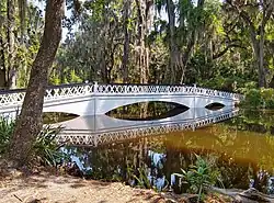 Drayton's focus now became rebuilding Magnolia's deteriorating gardens and postponing his ordination. He chose a garden format popular in the mid-nineteenth century called the Romantic style, a natural, informal approach to design and plantings. Drayton's "picturesque" style of Romanticism, "expressed by striking, irregular spirited forms", was a stark contrast to the formal, geometric style of nearby Middleton Place and a naturalistic expression at Drayton Hall, where "man exert[ed] control over the natural environment."[19] Drayton's Magnolia became an innovative showcase for unbridled natural beauty, "which allowed man and nature to co-exist. Wildness was glorified and enhanced, not tamed."[20] In the 1840s Drayton was one of the first people in the United States to plant Camellia japonica (Japanese camellia) outdoors on a large-scale and grow Azalea Indica (Indian azalea) outdoors.[21][22] His vision and genius turned Magnolia Plantation and Gardens into one of the world's most impressive, cultivated landscapes.[23][24]