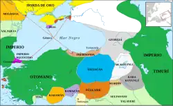 In 1442 the Ottoman Sultan Murad II sent out a fleet to plunder the shores and to attempt to capture the city. This expedition did not seriously affect Trebizond itself, but attacked Trebizond's dependencies in the Crimea and was partly destroyed by a storm on its return journey. The Ottomans did not make another attack on the Empire of Trebizond until the reign of the next Sultan, Mehmed II.[7] In February 1451 the Byzantine diplomat George Sphrantzes arrived in Trebizond seeking a bride for his emperor, Constantine XI Palaiologos. This incident is notable for the anecdote it relates about John, who gleefully related to Sphrantzes the news of the death of Sultan Murad II, and that Mehmed II's youth meant that now his empire could last longer and be blessed. Sphrantzes, however, was taken aback and explained to him that Mehmed's youth and seeming friendship were only ploys, and that under John's brother-in-law John VIII the empire had been deeply in debt, but now his new emperor was trying to change that.[8]