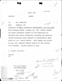 FBI teletype sent immediately after the Hebrew Benevolent Congregation Temple bombing, instructing agents to "thoroughly account for the whereabouts of Frederick John Kasper" before and after the time of the explosion