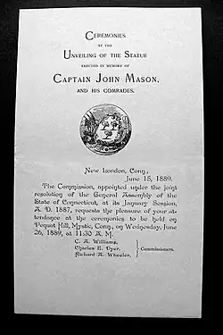 - ^ Maronn, Marcus (1996). John Mason Statue Report. Mystic & Noank Library, Indian & Colonial Research Center, Windsor Historical Society, CT. State Library: The Mason Family Memorial Association.