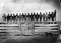 Row of butchers at a stockyard sale at South Spit in Westport, with auctioneer John Munro on the far right