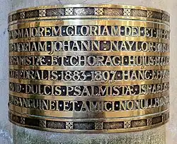 Ad Majorem Gloriam Dei et in piam Memoriam Johann Naylor Mus. Doc, Orgaistae et Choragi Hujus Ecclesiae Cathedralis 1883-1897 Hanc effigiem David Dulcis Psalmistae Israelis P C Consanguinei et Amici Nonulli MDCCCCIII