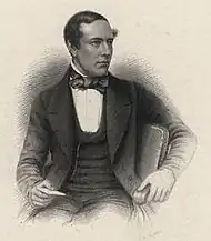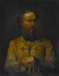 Nicholson was born on 11 December 1822 in Dublin, Ireland, the eldest son of Dr. Alexander Jaffray Nicholson and Clara Hogg, who were both descendants of Protestant Scottish settlers who had immigrated to Ireland as part of the Ulster Plantation.[7] Dr. Nicholson died when John was eight after contracting an illness from one of his patients, after which the family moved to Lisburn, County Antrim.[8] Nicholson was privately educated in Delgany and later attended the Royal School Dungannon, through the patronage of his maternal uncle, Sir James Weir Hogg, a successful East India Company lawyer and for some time Registrar of the Calcutta Supreme Court, and later a Member of Parliament.[9] He left school soon after his sixteenth birthday and, as the eldest male in his family, obtained a cadetship in the East India Company army's Bengal Infantry thanks to his uncle.[10] In early 1839, Nicholson spent several weeks under his uncle's tutorship in London, gaining an understanding of Indian matters, before departing Gravesend in mid February on the voyage to India where he would spend the majority of the rest of his life.[10]