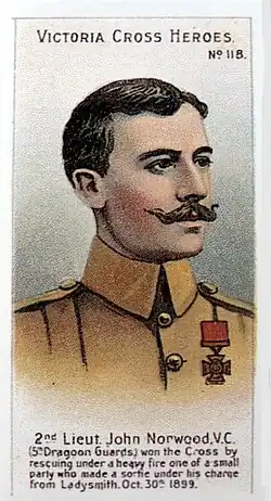 Norwood was 23 years old, and a second lieutenant in the 5th Dragoon Guards (Princess Charlotte of Wales's), British Army during the Second Boer War when the following deed took place at Ladysmith for which he was awarded the VC: