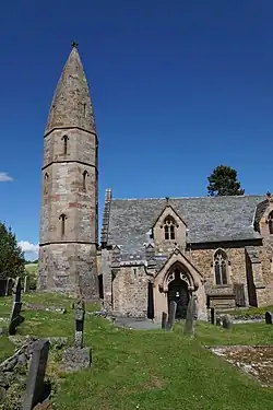 St Michael the Archangel is a Grade I listed church located in Llanyblodwel in Shropshire, England near England–Wales border. It has a spire of unusual shape and was designed in 1847–1856 by Parker during his time as its vicar. St Michael the Archangel was designed and rebuilt from a medieval church in stages between 1847 and 1853.[3] He designed the porches, ceilings, windows and reredos. The idiosyncratic almost detached steeple was designed and added 1855-6 by the same vicar, who also designed and built the two nearby listed buildings comprising the school house[4] and schoolmaster's house (at one time used as the post office).[5] The design has been referred to in the Pevsner Architectural Guides as "bizarre", but "unforgettable", particularly the tower, which was apparently modelled on that of Freiburg Minster.[6] The interior is even more unconventional, with many texts and stencilled patterns.