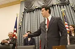 John Sarbanes at his swearing-in ceremony gesturing towards his father on the far left, former Senator Paul Sarbanes