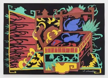 While still embedded with personal symbols (chairs, teapots, chinoserie, mandalas, and earlier, characteristic forms), Schacht's paintings differ from his drawings in their increased abstraction, intense colors and wider inspirations and imagery.[1][3][5] His paintings feature leitmotifs of ceramic vases, Persian textiles, quasi-psychedelic genitalia, cowboy hats and saloon doors in decentralized, rhythmic compositions that Brooklyn Rail critic Diane McClure and others describe as moving between disorder, play, and a sense of the surreal.[3][7][1]