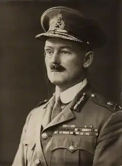 Shea served in the First World War, initially as a staff officer, first with the British Expeditionary Force and then with the 6th Division when he succeeded Colonel William Furse as the division's GSO1, or chief of staff.[9] In February 1915 he was made a CV.[10] In July he was promoted to the temporary rank of brigadier general[11] and became commander of the 50th (Northumbrian) Division's 151st (Durham Light Infantry) Brigade, a Territorial Force formation, which had recently arrived on the Western Front. He was made a brevet colonel in January 1916[12] and a temporary major general in May[13] and became general officer commanding of the 30th Division, a Kitchener's Army formation, which he led in the Battle of the Somme later that year. After being promoted to substantive major general in March 1917,[14] GOC 60th (2/2nd London) Division in Palestine in August 1917.[3] He commanded the division at the Battle of Mughar Ridge in November 1917, at the Battle of Jerusalem in December 1917 and at the First Battle of Amman in March 1918.[15] On 9 December 1917 he received the keys of the city of Jerusalem, an act symbolising its surrender by the mayor Hussein al-Husayni, after many other generals refused to take this responsibility.[16] He was appointed a Knight Commander of the Order of St Michael and St George in the 1919 New Year Honours.[17]
