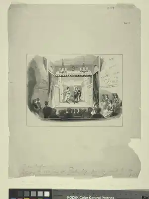 The John Street Theatre was modelled after Douglass's own Southwark Theatre in Philadelphia, the first permanent theatre in the United States,[2] which was itself modelled on the theatres of London.[4] No pictures survive of the building's exterior.[5] Dunlap described it as "principally of wood, an unsightly object, painted red". It was set 60 feet back from the street, with a wooden covered walkway from the pavement to the doors.[2][6] Inside, it had two tiers of boxes, a pit and a gallery. The dressing rooms and green room were located in a neighbouring shed,[5] although Dunlap speculates that these were originally under the stage.[6] Its seating capacity was approximately 750.[7]