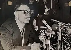 After the trial on November 23, 1954, the Chinese News Agency announced that it had captured and tried two American spies, letting the United States and Downey's family know he was alive.[3] The Eisenhower administration immediately protested.[7] Because their status as CIA officers was a secret, the U.S. Government claimed Downey and Fecteau were civilian employees of United States Army.[7] This complicated the efforts of U.S. officials, family members, and others to press for the men's release or even to make their plight widely known.[3] When Chinese Premier Zhou Enlai expressed willingness to discuss Downey and Fecteau's release and invited their families to visit, U.S. Secretary of State John Foster Dulles rejected his offer, forbade visits by their relatives, and claimed China had committed the "reprehensible" crime of holding Americans on "trumped up charges."[9] Zhou even offered to release the two men if the United States would admit they were CIA agents; the United States declined to respond.[9]