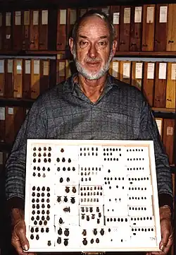 ![]() John Thomas Polhemus, displaying mounted insects from his collection. | |