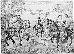 Around 1531, the son of John V, Henry III, had a series of eight tapestries with the genealogy of the House of Nassau woven.[52][53] These tapestries were lost in the 18th century.[52][54] The design drawings for the tapestries were made by Bernard van Orley. Seven of those drawings have been preserved,[54][55] only the design drawing for the fifth tapestry, depicting Count John I of Nassau-Siegen and Countess Margaret of the Mark, is missing.[55] The theme of the series was the descent of the House of Nassau, whereby the dynastic significance was paramount. This genealogy was given extra splendour by the fact that, in addition to the direct descent from Count Otto I of Nassau, Roman King Adolf was also included in the series.[52][53] On each tapestry, a man and woman sitting on horseback are depicted facing each other. The rather unusual composition remains lively due to the alternation in clothing and poses and the position of the horses. The mostly hilly landscape in the background is sometimes interrupted by trees in the foreground. The coats of arms in the top corners and the cartouche with the inscription in between are connected by garlands that stand out sharply against the sky. It is also clear from the designs for the first and last tapestry that the main scenes were surrounded by wide carpet borders.[55] The drawings also show the great care taken with the inscriptions in the cartouches, which are written in the same hand on all seven of the surviving drawings, and with the heraldic details of the coats of arms.[56] With the coats of arms, indications have been written in French about inaccuracies, especially about the mirror-image representation of the male arms. It is known that Henry III paid special attention to this aspect and corresponded with his brother William I about it. The design for the last tapestry in the series differs from the other designs in that it depicts three women instead of one. As the inscription does not mention the identity of the two women in the background, this has given rise to much speculation.[57]