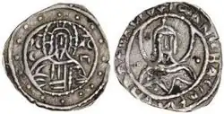 Andronikos predeceased John V, dying on 25 or 28 June 1385.[13] John VII inherited his father's lands around Selymbria and, as per the 1381 agreement, also inherited the right to use the title basileus, becoming a junior co-emperor of the Byzantine Empire. He also inherited his father's claim to be John V's legitimate heir.[1] From his position as junior emperor, John VII received support from the Ottoman Empire, especially from the time of Bayezid I's accession (1389) onwards, and from the Genoese.[18] The Genoese support did not escape the attention of John V. At some point between 1387 and 1391, John V is recorded as having complained to the Genoese that the inhabitants of Galata were acclaiming and saluting John VII as if he were the senior emperor, while denying John V the appropriate honours.[19]