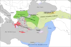 The Palaiologos dynasty, in power since 1259/1261,[7][8] was often plagued by infighting, with the emperors and princes of the family often being unable to cooperate among themselves, to the detriment of the empire.[9] The main enemy of the Byzantines at this time was the Ottoman Empire, which throughout the 14th century conquered vast swaths of former imperial territory.[10] John V had even agreed to serve the Ottoman sultan Murad I (r. 1362–1389) as a tributary vassal.[11] At this time, despite geopolitical adversity, Byzantine and Ottoman aristocrats were in close contact with each other.[12]