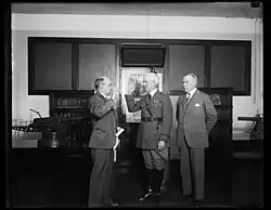 Gulick being sworn in as Chief of Coast Artillery. His predecessor Andrew Hero Jr. is at right.