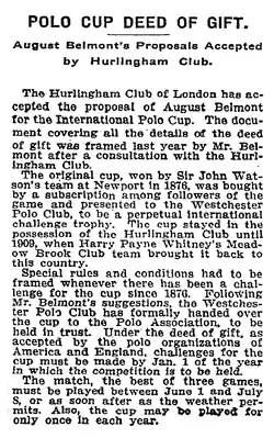 2. ^ "Polo Ponies Sail To-Day. Will Be Used in the International Match at Hurlingham. The Pick Of Six Stables. Twenty-four in All, Furnished by Gould, Mackay, Cowdin, Agassiz, and "Larry" Waterbury". New York Times. 11 January 1902. Retrieved 5 April 2011. ... the American team hopes to bring back to this land the challenge trophy which was carried back to England by John Watson's polo team from the Hurlingham Club ...