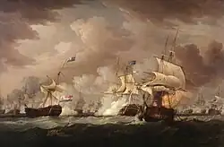 Having returned to Duncan's fleet, Wells fought in Lancaster at the Battle of Camperdown on 11 October where the British fleet defeated their Dutch opponent. Lancaster fought in the starboard line of British ships and had three men killed and another eighteen wounded in the battle.[4][17] She was one of three British ships to attack the leading ships of the Dutch fleet and Wells then had her engage the ship of the line Beschermer before moving down the line of battle to assist other British vessels in their fights.[18] Despite being criticized for his conduct during the battle, Wells received the Naval Gold Medal and participated in the procession that saw the captured Dutch ship's colours hung in St Paul's Cathedral. Lancaster transferred to serve on the Irish Station in 1798 before going in for a refit in April 1799. Wells stayed in command of Lancaster until the refit was completed in May, at which point he handed over command and left the ship. He did not serve at sea again.[4][12][19]