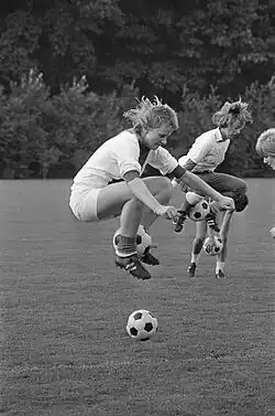 José van Hoof (born 22 August 1952)[3] is a retired Dutch footballer who played as a striker for PSV in the 1970s. She was referred to as the female Johan Cruyff.[3][4] In 1971 she was part of the Dutch team that played the first FIFA, but not the Royal Dutch Football Association (KNVB), recognised international women's match ever.[5] In 1973, she was the only player left over from that '71 team, who played in the first KNVB sanctioned game versus England.[6]