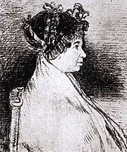 Josefa Bayeu (1747–1812) was Goya's wife from 1773 until her death in 1812. She came from a wealthy Aragonese family with artistic traditions. Her brother was Francisco Bayeu, a painter who supported Goya's career at the royal court. Despite her background, Josefa was most likely illiterate.[2] Xavier de Salas Bosch describes her as naive, good-natured, and foolish.[10] Goya married her for the connections her family had in artistic circles. Little is known about her life alongside the painter. Josefa became pregnant multiple times (perhaps even 20 times) and suffered miscarriages. Only seven of her children survived infancy, and only her son Francisco Javier reached adulthood. Josefa's repeated motherhood was a significant burden for her, both physically and mentally.[2] The artist rarely mentioned his wife in his extensive correspondence, and she was not his model.[11] The only confirmed image of Josefa that has survived to modern times is a small charcoal sketch from 1805 depicting her profile. It shows nearly 60-year-old Josefa as an aged, slightly stooped woman with sagging skin and a tired expression.[8][11] She appears calm, with a hint of melancholy in her eyes. She wears a cap on her head and has a woolen shawl draped over her shoulders.[12] Her physiognomy does not correspond to the delicate features of the young lady depicted in the oil portrait.[8][13]