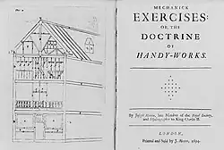 Moxon's Mechanick exercises was published in parts between 1677 and 1684. It was completed in two volumes: the first giving instructions on metalworking, woodworking, brick-laying and sundial-construction; and the second (issued 1683–1684) providing a detailed series of instructions for printers, including typefounding, composition, press-work etc., which have given printing historians much (probably idealised) information on the working practices of hand-press period printing-houses.[2]