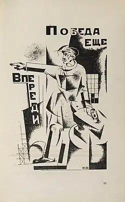 His illustrations for Youth, Go! convey an image of the body reduced to a number of basic geometric shapes – circles, triangles, rectangles; a body devoid of symmetry and naturalness, and instead resembling a mannequin with limbs suspended on spherical joints and body parts freely detachable one from another. ... In Youth, Go!, the anatomy of the human hand is followed by the anatomy of an axe, insofar as both are part of a single whole: the new socialist working class.[2]