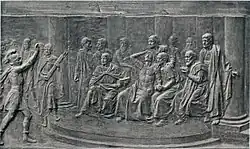 Before WWI, Urbania began to produce anti-war allegory works. His massive wood-carving The Last Battle (1905), a scene from the Russo-Japanese War, was donated to the Dežel Museum in 1906 and is now on display at the National Gallery of Slovenia.[7] Other anti-war pieces include: Hail Caesar (1915)[8] After the Battle (1908)[9] and Hannibal at the Gates (1908).[10] His large carved-wood relief Z Doma (or Far from Home, 1908)[11] was a sentimental self-portrait framed in branches and leaves.