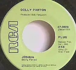 "Joshua" is a song written and recorded by American country music artist Dolly Parton. It was released on November 9, 1970, as the first single and title track from the album Joshua. The song was significant for being her first single to reach number 1 on the US country charts.[1] The single reached number 1 on the Billboard country charts in February 1971. Parton received her first Grammy nomination in the Best Country Female Vocal category for the song, losing to Lynn Anderson.