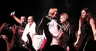 The shows were held at 6 and 8 p.m. to a sold out audience of 3,000 each; both shows lasted for one hour and forty minutes.[20][21][13] Wakeman was unable to secure two seats for his parents, and resorted to buying a pair for £15 from a ticket tout.[20] A screen placed above the stage was used to present stock footage of mountains and underground caves at first, until 20th Century Fox granted permission to use clips from the 1959 American film adaptation.[21][5] Plans to film the concerts for a prospective home video release fell through.[13] Bassist Roger Newell recalled several politicians, John Lennon, Yoko Ono, Paul McCartney, Yes guitarist Steve Howe, and Peter Sellers in attendance.[22] Hemmings sat on a throne with the narrative script on his lap. He had a black eye at the time, after his wife found out he had cheated on her and had hit him. Wakeman's then-wife administered makeup to disguise the bruising.[3][21]