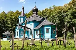 In 1948, the church in Koterka became the parish church because, after the establishment of the Polish-Soviet border, the St. Michael the Archangel Church in Tokary fell within the territory of the Byelorussian Soviet Socialist Republic,[3] where most of the Orthodox residents' houses were also located.[5] In the new political situation, pilgrimages from Belarus became impossible. It was only in 1990 that a solemn procession was organized with the participation of several thousand faithful and 15 priests from the Polish part of Tokary to the Belarusian part. The church continues to be an important pilgrimage center despite the decline in the population of neighboring villages.[1][3] Metropolitan of Warsaw and All Poland, Sawa, presided over the Feast of the Holy Trinity celebrations in Koterka several times,[3][5] and bishops Grzegorz of Bielsko (in 1998) and Jerzy of Siemiatycze (in 2007) also visited the temple.[1] The church was entered into the list of heritage registers on 28 December 1984, under No. A-64.[6] In 2012, the centenary of the construction of the church was commemorated by placing a six-meter cross with a painting by Jarosław Wiszenko, funded by foresters from the Nurzec Stacja forestry, next to it.[5] There are also other wooden votive crosses near the temple.[1]