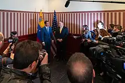 Spanish newspaper El País described U.S. president Donald Trump's election—coinciding with the election of conservative presidents in Colombia and Brazil, along with deteriorating conditions in Venezuela—as "a perfect storm," influenced by hawks in the Trump administration.[83] Opposition members Carlos Vecchio, Julio Borges and Gustavo Tarre were consulted, and the Trump administration decision to back Guaidó formed on 22 January, according to El Pais.[83] U.S. Secretary of State Mike Pompeo, National Security Adviser John R. Bolton, Treasury Secretary Steven Mnuchin and others met with Trump that day, and Vice President Mike Pence called Guaidó that night to express U.S. support, according to The Wall Street Journal.[85] According to El País, the January Lima Group meeting and the stance taken by Canada, represented by Chrystia Freeland, were key factors leading Donald Trump, known for being an isolationist, to become involved in Venezuela.[83]