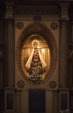 The statue of the Virgin, a 14th-century late Romanesque piece, is located in the Basilica of Our Lady of Miracles in Ágreda, positioned within the central niche of a baroque altarpiece.[2] The statue of the Virgin, whose creator remains unknown, dates back to the 14th century. Prior to 1527, it was called the Virgin of Yanguas, named after the town where it was reportedly discovered by a shepherd named Miguelillo.[8] The statue depicts her seated on a gilded footstool supported by two clouds. She has dark skin, slightly disproportionate white hands, and wears black boots. Her golden mantle stands out against the deep red of her tunic.[9]