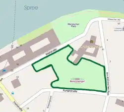 The park lies between Wallstraße on the north side, the Straße am Köllnischen Park on the east side, Rungestraße on the south side and Inselstraße on the west side.[2] Its boundaries are not clearly delimited; on the west side there are some buildings between the park and the street, including the former building of the Köllnisches Gymnasium, built in 1865–68 and now used as a music school, and on the north side, facing the river, is the Märkisches Museum. The western edge is dominated by a large office building built in 1903/04 as the headquarters of the Landsversicherungsanstalt, which has been used for the past few years by the Department of Urban Development of the Senate of Berlin, and the southern by the 1931/32 building of the German health insurance group Allgemeine Ortskrankenkasse, which under the German Democratic Republic was the Parteihochschule Karl Marx.
