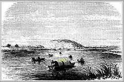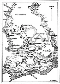 In the past, the area flooded by the Niger was more extensive than today. In years with high rainfall the floodwater would reach the western outskirts of Timbuktu itself.[1] The Koriomé canal from Daï to Kabara was dug by the emperor Soni Ali Ber when he captured Timbuktu in 1468. An extension known as the "Hippopotamus Canal" was later excavated from Kabara up to Timbuktu.[2] A small navigable waterway to the west of Timbuktu is shown on the maps published by Heinrich Barth in 1857 and Félix Dubois in 1896.[3][4]