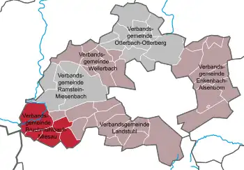 Bruchmühlbach-MiesauGerhardsbrunnLambsbornLangwiedenMartinshöheEnkenbach-AlsenbornFischbachFrankensteinWaldleiningenWaldleiningenHochspeyerMehlingenMehlingenNeuhemsbachSembachBannHauptstuhlKindsbachKrickenbachLandstuhlLindenMittelbrunnOberarnbachQueidersbachSchoppStelzenbergTrippstadtFrankelbachHeiligenmoschelHirschhornKatzweilerMehlbachNiederkirchenOlsbrückenOtterbachOtterbergSchallodenbachSchneckenhausenSulzbachtalHütschenhausenKottweiler-SchwandenNiedermohrRamstein-MiesenbachSteinwendenErzenhausenEulenbisKollweilerMackenbachReichenbach-SteegenRodenbachSchwedelbachWeilerbachKaiserslauternSüdwestpfalzZweibrückenSüdliche WeinstraßeLandauBad Dürkheim (district)DonnersbergkreisKusel (district)Birkenfeld (district)Saarland