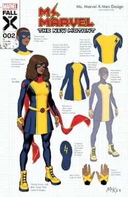 Later that month, Kamala starred in Ms. Marvel: The New Mutant, a four-issue limited series that follows Kamala's new status as a mutant and as member of the X-Men. The series was written by Iman Vellani, who portrays Kamala in the MCU, and Sabir Pirzada, who wrote Dark Web: Ms. Marvel and episodes of the Ms. Marvel show, and drawn by Carlos Gómez and Adam Gorham.[159][48] McKelvie updated Kamala's costume to highlight "her newfound mutant identity, with X-Men logos replacing the traditional Ms. Marvel lightning bolt that dates back to Carol Danvers".[159] Polygon commented that Kamala's "new yellow and blue costume from her original designer" is "befitting her new X-Men-y origin".[48] In the miniseries, Kamala is sent by the X-Men on an undercover mission to infiltrate an Orchis-sponsored summer program at Empire State University (ESU) as a student. Ms. Marvel's ties to the X-Men and her mutant status are exposed, resulting in anti-mutant backlash against her.[160] Kamala was also featured in the main ongoing X-Men series, starting in X-Men (vol. 6) #26 (September 2023).[161][162][163]