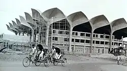 Dhaka's urban status grew in the early 20th century, and so did its economy, especially after the partition of India and independence of Pakistan in 1947. The existing railway lines extended northwards bisecting Dhaka into old and new cities, and these railway lines intersected with roads at various points, blocking the flow of north–south road traffic. Also the old Dacca railway station on the northern side of the city was incomplete, consisting of a platform, a small yard and a locomotive shed. Relocating the station to a less congested area is expected to facilitate unhindered north–south vehicular flow, and also bring old and new Dhaka cities together. In 1948, experts suggested shifting the station to Kamalapur.[6] In 1952, a plan of shifting the railway station outside of the city area was made. It was also planned to build a new railway line from Tejgaon to Gandaria. However, due to the fund shortage the plan wasn't executed that time.[10] After 10 years of the suggestion on 20 December 1958, the provincial government finalized to construct the new railway station in Kamalapur with the deadline of 1964. The initial budget for its construction was Rs. 45.6 million (equivalent to Rs. 230 million or US$800,000 in 2021) of which the provincial government was supposed to provide about 60%.[11] Before the construction of the station, there was a paddy field at the construction site.[5] The government started the construction in 1960.[10] From Tejgaon the railway line was diverted to Khilgaon, and then to Kamalapur.[6] The operational elements and logistics of old Dacca railway station was transferred to the new railway station in 1965.[10] The station was inaugurated by East Pakistani governor Abdul Monem Khan on 27 April 1968.[12] Pakistani president Ayub Khan was at the inauguration ceremony.[6] Its construction cost was Rs. 135 million (equivalent to Rs. 690 million or US$2.4 million in 2021).[12] A year after that, the headquarters of the railway mail service of the province was moved here.[13]