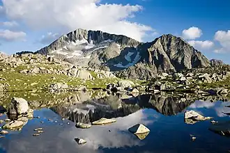 Kamenitsa (Bulgarian: Каменица [ˈkamɛnit͡sɐ]) is a peak in the Pirin mountain range, south-western Bulgaria. It is located in the northern part of Pirin on the 22 km-long Kamenitsa secondary ridge between the summits of Malka Kamenitsa to the north and Yalovarnika (2,763 m) to the south.[1] Its height is 2,822 m which ranks it on fifth place in Pirin, behind Vihren (2,914 m), Kutelo (2,908 m), Banski Suhodol (2,884 m) and Polezhan (2,851 m).[1][2] The peak is built up of granite blocks covered in lichens.[2]