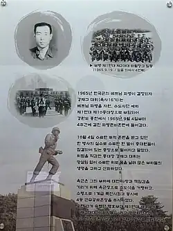 • 1965 - On August 29, he was appointed as the 10th lieutenant of the 1st Regiment of the Capital Mechanized Infantry Division (a.k.a.'Maengho' - fierce tiger) as the dispatch of a Korea military division to Vietnam was decided.