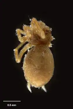 The female s recorded at 1.84mm in length. The cephalothorax and legs are orange brown. The abdomen has a chevron pattern dorsally.[1]