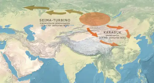 2. ^ Chernykh 2008, p. 90: "The East Asian Metallurgical Province [EasAsMP]. (...) As mentioned above, the EasAsMP’s earliest phase was associated with the striking Seima-Turbino transcultural phenomenon, and subsequently it seems to continue the Seima-Turbino traditions of metallurgy and metal processing. The most important materials characteristic of the early EasAsMP come from burials of the widely known Karasuk cultures (Chlenova 1972; Chernykh 1992: 264-271) (13). The numerous metal finds come from graves, most of which have been destroyed by recent tillage."