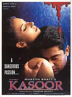Kasoor (transl. Fault) is a 2001 Indian Hindi-language legal thriller film directed by Vikram Bhatt and produced b Mukesh Bhatt's Vishesh Films. It stars Aftab Shivdasani and Lisa Ray in her Hindi film debut. Ray's voice was dubbed by Divya Dutta,[4][5] while Shivdasani's voice was dubbed by Bhatt himself.[6] Apoorva Agnihotri, Irrfan Khan and Ashutosh Rana appear in supporting roles. The film was released on 2 February 2001,[7] and was a critical and commercial success.[8][9] It is notable for the soundtrack composed by Nadeem–Shravan.[10]