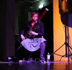Young's music involves electroacoustic music and sonic art, and she also plays as a bassoonist in her work.[3] She recorded with Braxton in an album released in 2008.[4] In 2019, she was the featured composer for the sixth season of Basscon's Wasteland festival, with one of her pieces being Arthur Russell's Hiding Your Present From You (1986).[7] Aaron Cohen of the Chicago Tribune noted that she "thrives in unexpected terrain" and that "her basic impulse remains straight-forward".[2] Tamzin Elliott of San Francisco Classical Voice said of Young: "Her vocabulary of string techniques — bowing on the body of the instrument, grinding the bow into the string, playing behind the bridge, etc. — was markedly uniform between the pieces, to the point where I wondered about the intentionality of this similarity."[7]