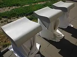 After World War II, the villas on Katowicka Street were converted into multi-room apartments, forcibly accommodating tenants in the pre-war owners' residences.[4] Moreover, a section of the street between Zwycięzców and Obrońców (approximately 250 meters[5]) was selected for reconstruction by the Capital Reconstruction Office. The experiment aimed to transform it into a showcase street ("Street of Warsaw's Future")[6] by removing fences, introducing greenery, and decorating it with street furniture.[7] According to press reports, the initiative was well received by residents. The team of architects responsible for the reconstruction, led by Bohdan Lachert, also collaborated with a group of sculptors, mainly residents of Saska Kępa, who worked on their projects voluntarily under the direction of Professor Tadeusz Breyer.[8] The best-preserved decoration from that period is the bas-relief Plon from 1947,[9] which was restored in 2011.[10] Other remnants of the post-war reconstruction of the street include remnants of benches, the external decoration of the staircase in house number 8A, and a few surviving house marks from the Capital Reconstruction Office[11] (plates marking buildings rebuilt with the help of Capital Reconstruction Office).[12] The former layout of the square in front of Plon became an inspiration for one of the projects submitted in 2014 to the participatory budget.[13]