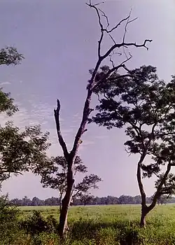 View of a leafless tree viewed from a watchtower in Kaziranga National Park with the backdrop of the grasslands and the forest in the distance