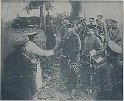 The Lithuanian Republic's military attaché in Germany, Colonel of the General Staff Kazys Škirpa, introduces himself to the President of Germany, Field Marshal Paul von Hindenburg, during the German army maneuvers in the Kissingen district in 1930.