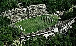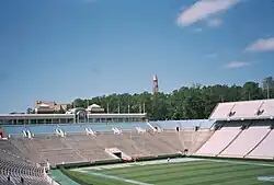 The North Carolina football team had been playing in Emerson Field since 1916 and by the mid-1920s the stadium, which sat 2,400 was too small for demand.[3] When the school played their annual rivalry game against Virginia in 1925, 16,000 fans stood on the sideline or sat in wooden bleachers which were not "favorably situated" to view the game.[4] The issue was so great for some fans that they refused to attend any more football games in Chapel Hill until the seating issue was resolved.[5] Captain Isaac Edward Emerson, who was now living in Baltimore, Maryland, offered in late 1925 to give $22,000 to improve Emerson Field.[3] The Winston-Salem Journal wrote that the stadium was needed for increasing attendance demand, hosting intramurals, and "the need of the state for a convocation place for large gatherings."[4] At the time the stadium could not seat the entire student body and had the smallest stadium of all regional schools for those with "similar importance."[4] Interest was growing for students to attend athletic events at the time.[4] In addition, the school desired to schedule larger Southern institutions like Alabama, Georgia, and Tulane, among others.[4][5] At the time larger schools avoided playing smaller schools since the gate receipts were split between teams.[4] Larger teams would avoid smaller schools since they could not afford the difference in gate receipt revenue.[4]